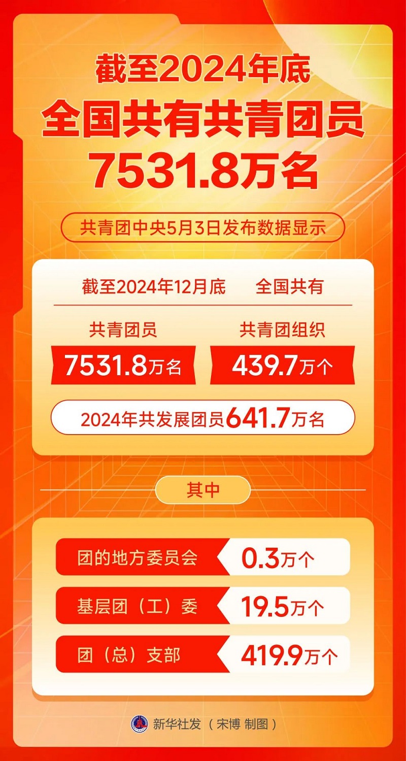 共青团中央2025年5月3日发布数据显示,截至2024年12月底,全国共有共青团员7531.8万名,共青团组织439.7万个。2024年共发展团员641.7万名。 新华社发 宋博/制图